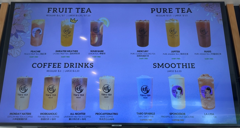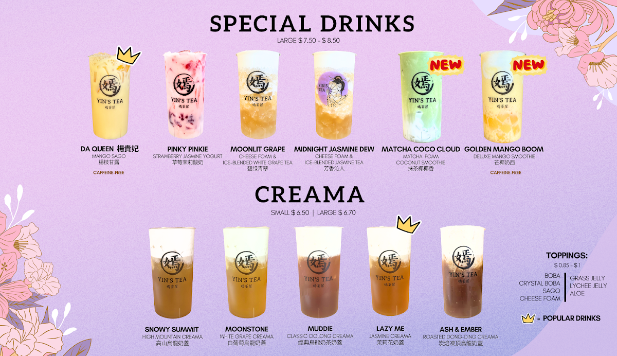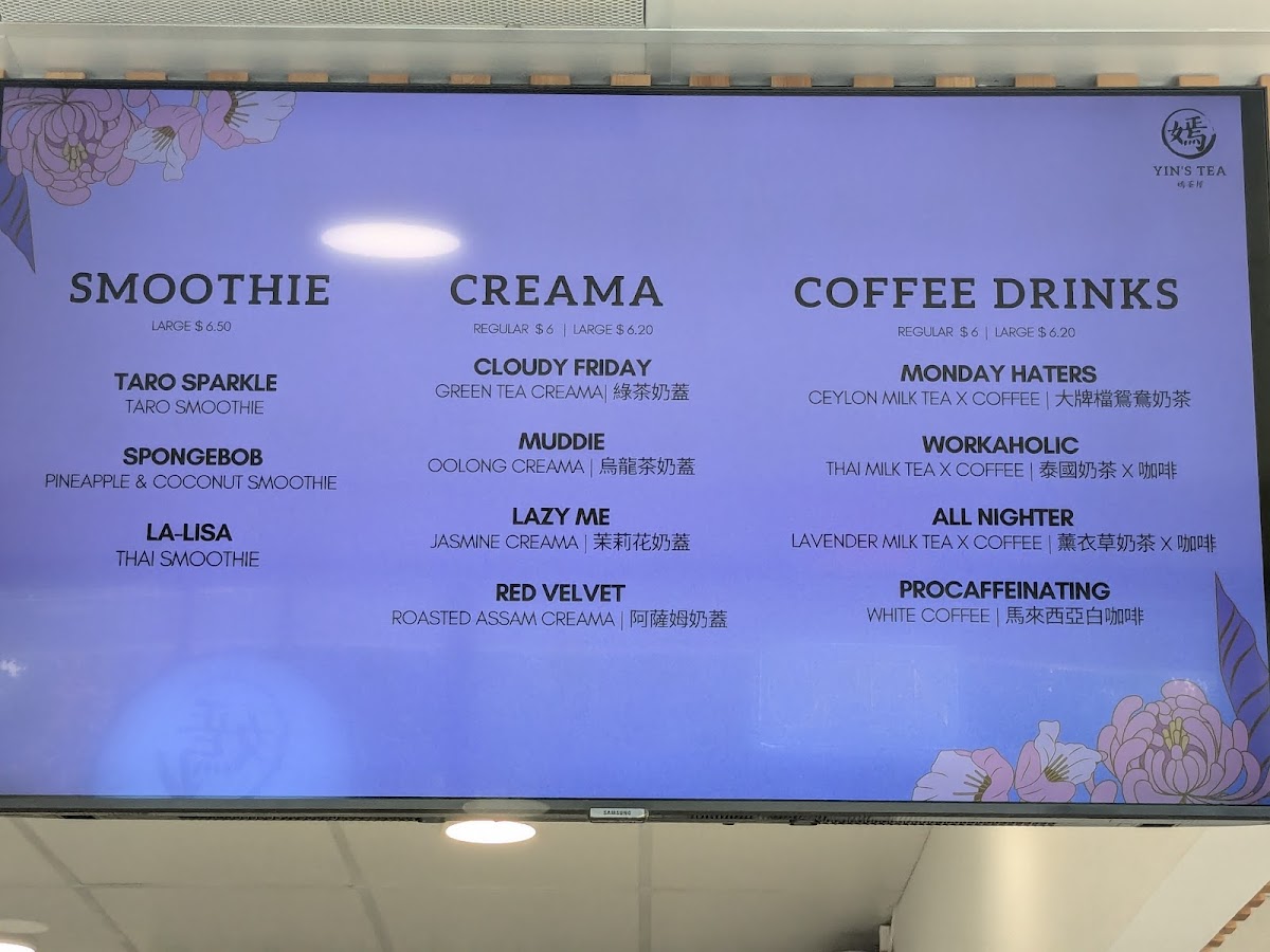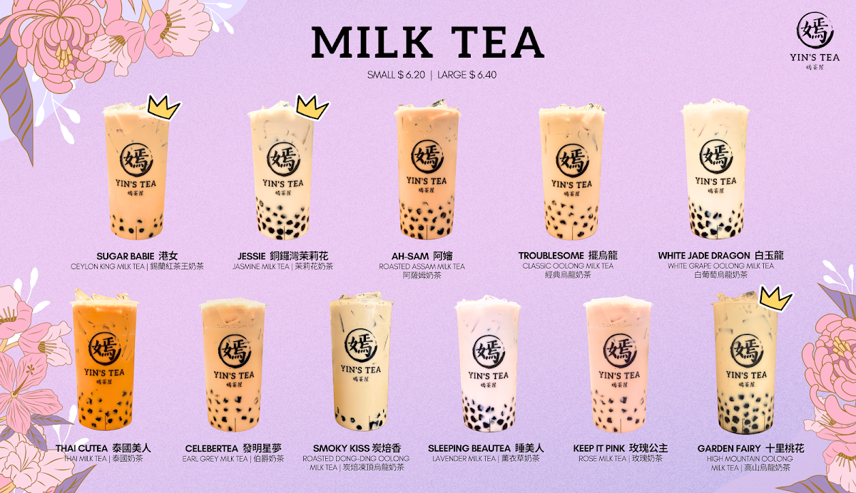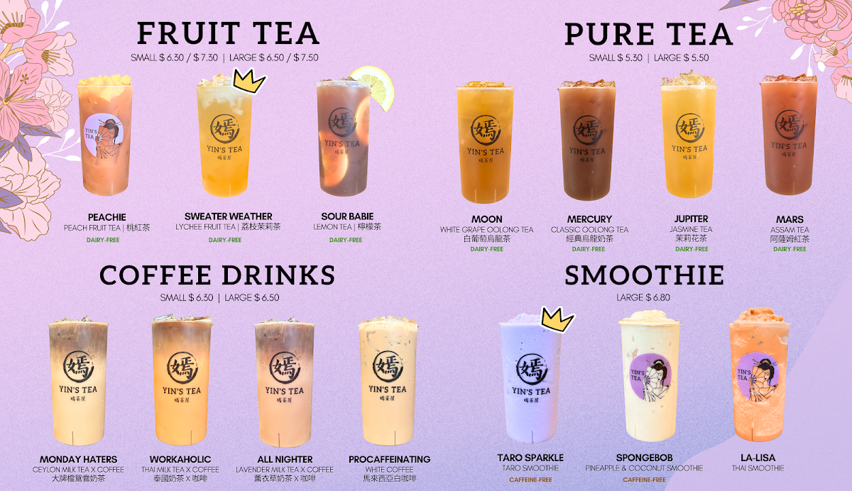 The menu at Yin's Tea | 嫣茶屋 offers a wide variety of drinks that cater to all tastes, from rich milk teas to refreshing fruit teas and innovative special drinks. For milk tea enthusiasts, there's the fragrant Garden Fairy 十里桃花 and the sweet Sugar Babie 港女, priced at reasonable rates. For a unique twist, try the Jessie 銅鑼灣茉莉花Ah-Sam 阿嬸 or the bold Troublesome 擺烏龍. If you prefer fruit teas, options like the refreshing Peachie and the cozy Sweater Weather offer delightful, fruity flavors. The Sour Babie brings an exciting tang to the table. Creamy creations include the indulgent Snowy Summit and the smooth MuddieLazy Me, as well as Ash & Ember. For those seeking a more pure tea experience, the Moon, Mercury, and JupiterMars teas provide a celestial selection. Smoothie lovers can enjoy the fun flavors of Taro Sparkle and the quirky SpongeBob, or go for the trendy LA-LISA. Special drinks like the Golden Mango Boom 芒椰奶西 and the fresh Matcha Coco Cloud 抹茶椰椰香 (both new additions) stand out with bold, unique flavors. For coffee lovers, the Monday Haters 大牌檔鴛鴦奶茶 and the Workaholic 泰國奶茶 x 咖啡 are great choices. There’s also the intriguing All Nighter 薰衣草奶茶 x 咖啡 and the energizing Procaffeinating 馬來西亞白咖啡. Guests can customize their drinks with options like Homemade Milk, Whole Milk, or Lactose-Free Milk, and add fun toppings such as Boba, Crystal Boba, and Grass Jelly. With a variety of sizes and the mystery-filled Mystery Cup offering plushie gifts, Yin’s Tea presents a playful, flavorful experience for anyone seeking an enjoyable drink adventure.