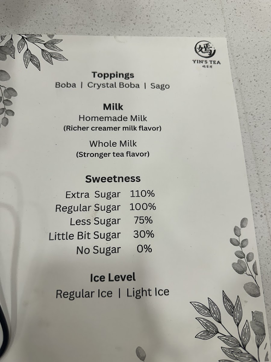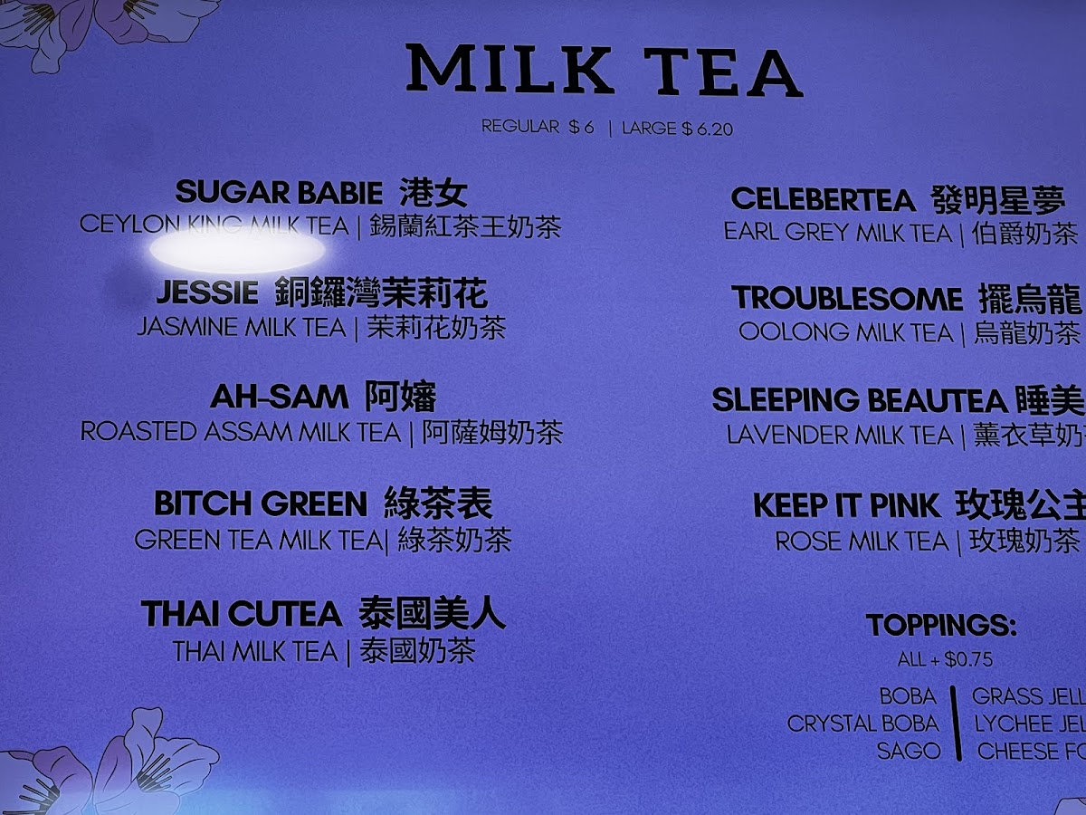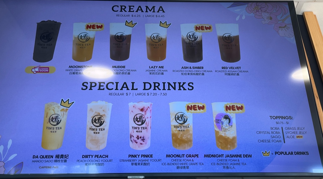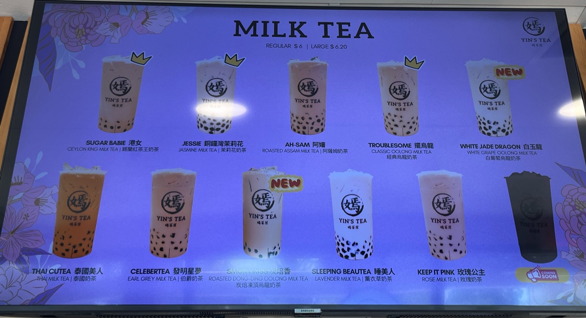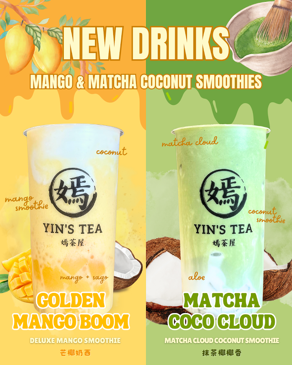 The menu at Yin's Tea | 嫣茶屋 offers a wide variety of drinks that cater to all tastes, from rich milk teas to refreshing fruit teas and innovative special drinks. For milk tea enthusiasts, there's the fragrant Garden Fairy 十里桃花 and the sweet Sugar Babie 港女, priced at reasonable rates. For a unique twist, try the Jessie 銅鑼灣茉莉花Ah-Sam 阿嬸 or the bold Troublesome 擺烏龍. If you prefer fruit teas, options like the refreshing Peachie and the cozy Sweater Weather offer delightful, fruity flavors. The Sour Babie brings an exciting tang to the table. Creamy creations include the indulgent Snowy Summit and the smooth MuddieLazy Me, as well as Ash & Ember. For those seeking a more pure tea experience, the Moon, Mercury, and JupiterMars teas provide a celestial selection. Smoothie lovers can enjoy the fun flavors of Taro Sparkle and the quirky SpongeBob, or go for the trendy LA-LISA. Special drinks like the Golden Mango Boom 芒椰奶西 and the fresh Matcha Coco Cloud 抹茶椰椰香 (both new additions) stand out with bold, unique flavors. For coffee lovers, the Monday Haters 大牌檔鴛鴦奶茶 and the Workaholic 泰國奶茶 x 咖啡 are great choices. There’s also the intriguing All Nighter 薰衣草奶茶 x 咖啡 and the energizing Procaffeinating 馬來西亞白咖啡. Guests can customize their drinks with options like Homemade Milk, Whole Milk, or Lactose-Free Milk, and add fun toppings such as Boba, Crystal Boba, and Grass Jelly. With a variety of sizes and the mystery-filled Mystery Cup offering plushie gifts, Yin’s Tea presents a playful, flavorful experience for anyone seeking an enjoyable drink adventure.